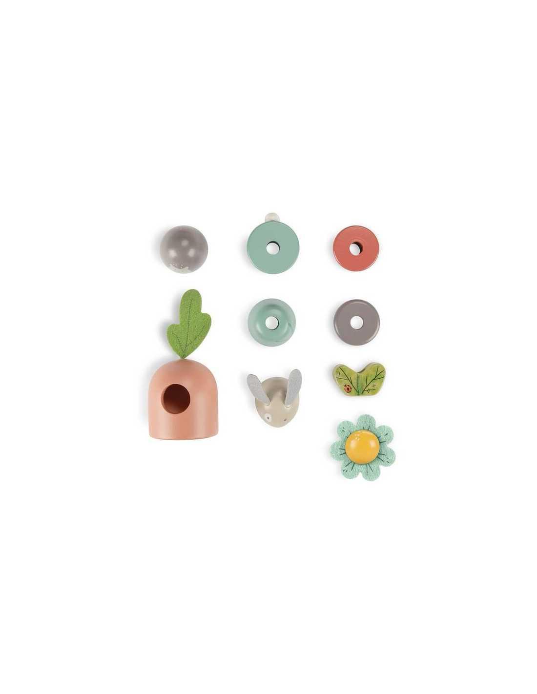 Ce jouet à empiler en bois fait partie de la collection tendre et poétique Trois Petits Lapins.